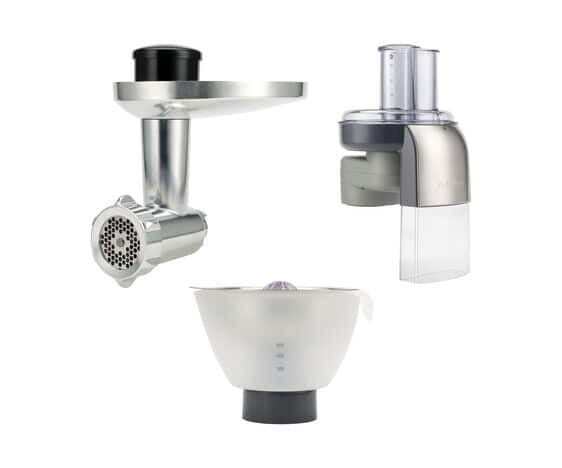 The Citrus Juicer will extract the juice from citrus fruits in no time, and with no bits. Juicing directly into a 0.6L bowl, it can then be easily poured into a glass. The Food Mincer easily and quickly grinds meat, fish, vegetables and even fruit peels. It includes a sausage and kebbe maker for additional versatility. The powerful Continuous Slicer/Grater works non-stop as you feed in the ingredient, achieving consistent results, making cooking and impressive presentation a whole lot easier.